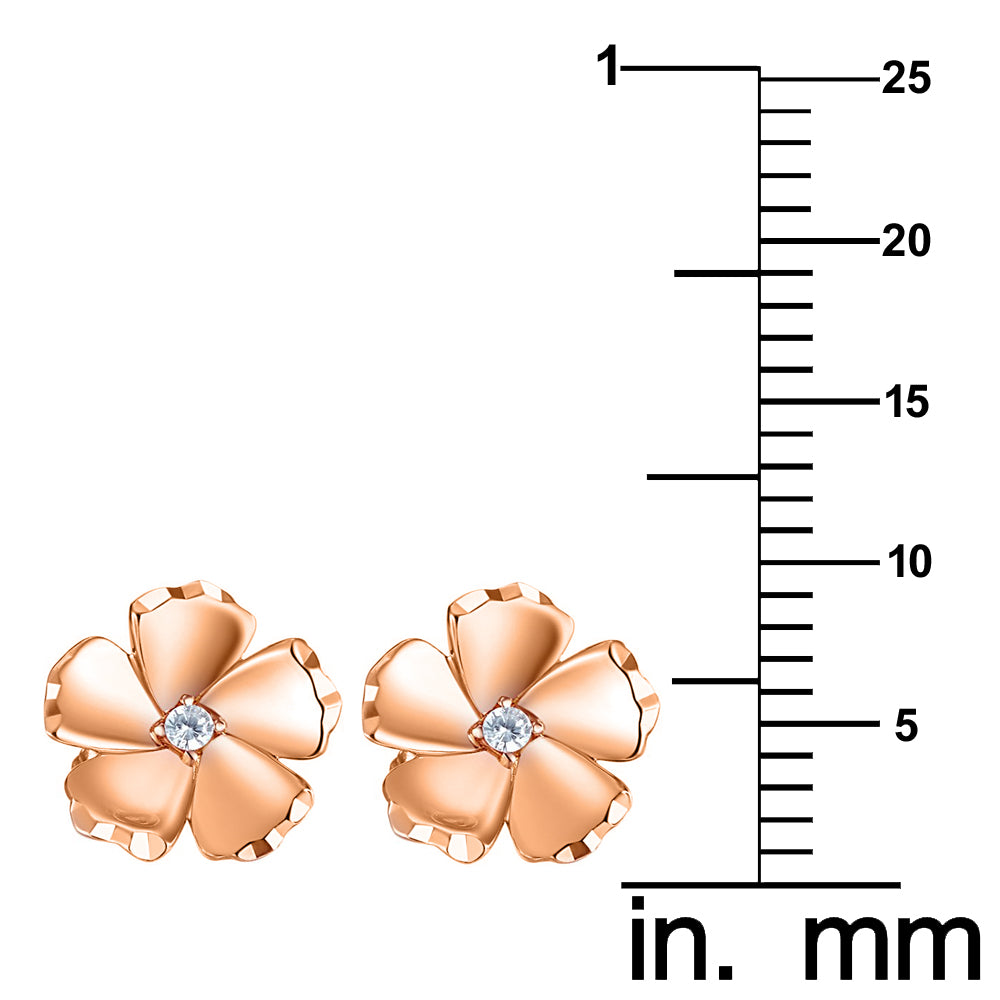 These stud earrings are expertly crafted from 14-karat rose gold, showcasing a harmonious blend of polished and satin finishes. With a diameter of 9 mm, the classic flower design is both elegant and timeless. At the heart of each earring lies a stunning single round-cut cubic zirconia, delicately set in a micro-prong setting, which adds a touch of brilliance and sophistication to the overall look. The earrings are designed for convenience and security, featuring a reliable pushback closure that ensures a comfortable fit. The 14-karat gold material offers a lightweight feel without compromising on durability or style. It is important to note that all weights and measurements provided are approximate and may vary slightly from the listed dimensions. These gold earrings are an ideal choice for those seeking a versatile accessory that can transition seamlessly from everyday wear to special occasions. With their exquisite design and quality construction, these gold stud earrings are a wonderful addition to any jewelry collection, making them a thoughtful gift for yourself or a loved one. The combination of genuine gold and a captivating cubic zirconia makes these earrings a charming accessory that will surely catch the eye.
