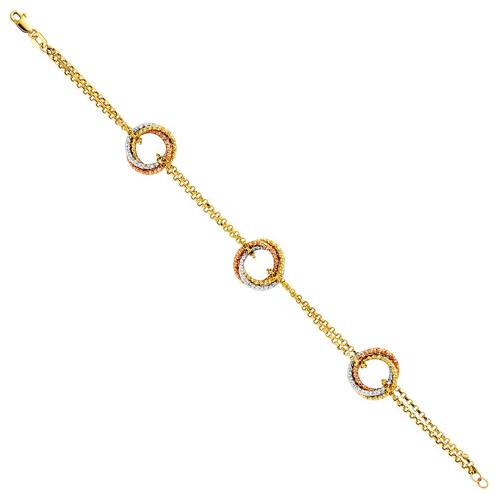 Introducing a stunning bracelet crafted from solid 14-karat gold, designed to make a statement. This exquisite piece features a double chain that intricately loops around three sets of diamond-cut circles. These circles are uniquely intertwined, showcasing a tri-color palette of white, yellow, and rose gold, which adds depth and elegance to the design. Measuring 7.5 inches in length, the bracelet is secured with a reliable lobster claw clasp, ensuring it stays comfortably in place. This versatile bracelet is perfect for various occasions, including weddings, birthdays, holidays, Mother's Day, anniversaries, or simply as a fashionable accessory for formal attire. It is suitable for women and comes packaged in a stylish gift box, making it an ideal present. For your peace of mind, a satisfaction guarantee is offered, along with a 30-day return policy for any unused or unaltered items. Please note that this jewelry is not intended for children under the age of 14. Embrace elegance with this unique bracelet, a timeless addition to any jewelry collection.