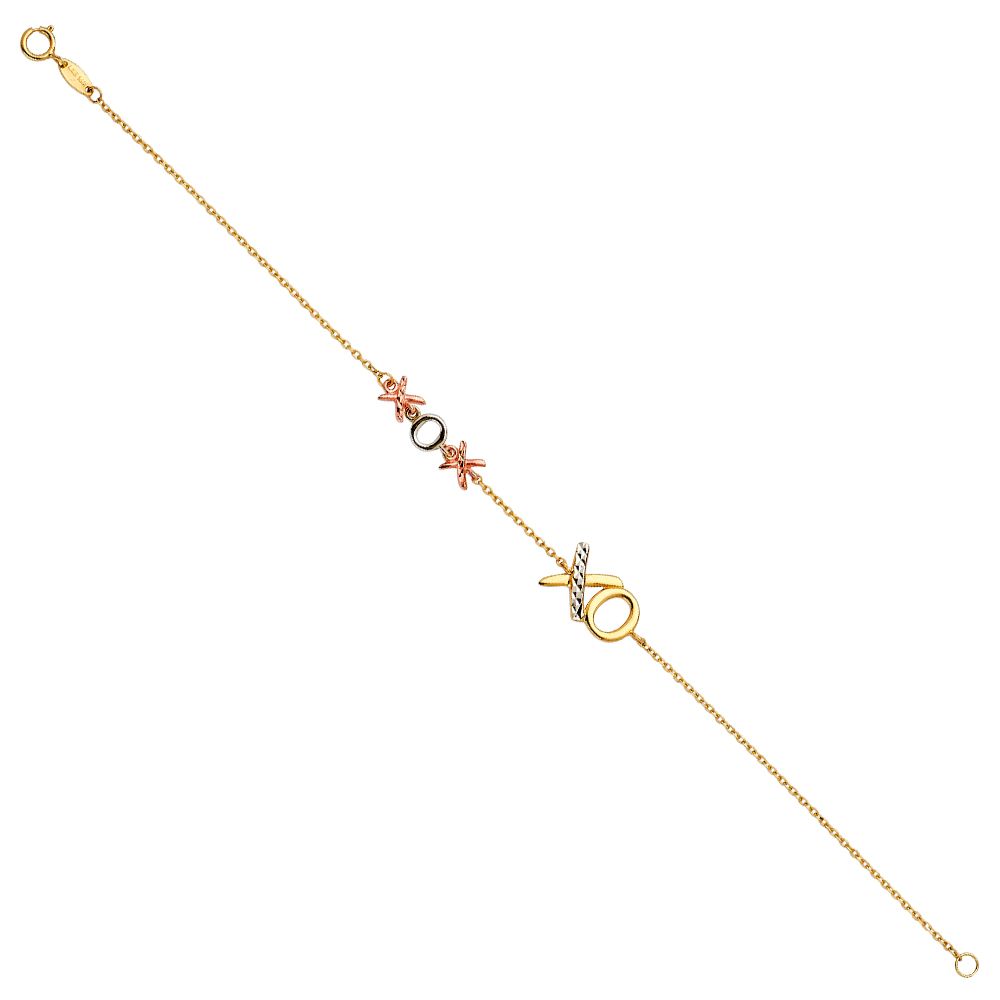 14K Tri-Tone Gold 'XOXO' Charm Chain 7"+1" Ladies Bracelet