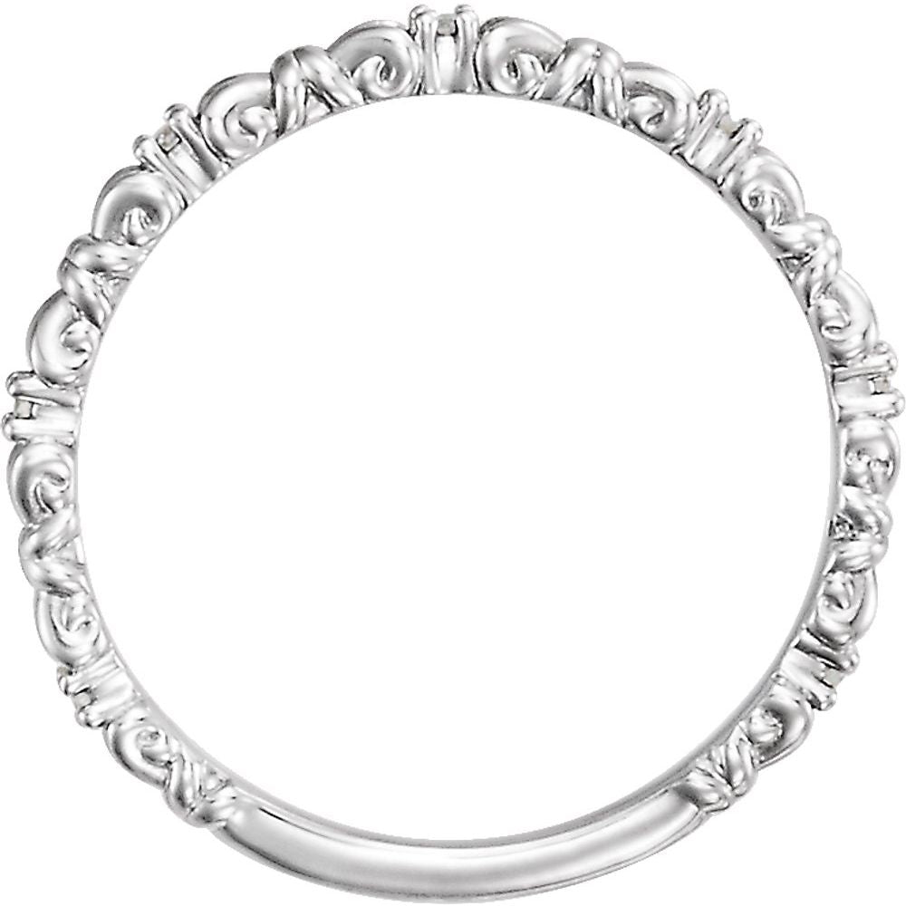 This exquisite 14K White Gold Stackable Ring is enhanced by the brilliance of white diamonds. The elegant design features a charming bow motif expertly integrated along the polished band, which measures 2.15 mm in width and is complemented by a slender shank width of 1 mm. The ring is adorned with seven round-cut natural diamonds, each measuring 1.1 mm, securely set in a prong style. The total diamond weight is 0.04 CTW, showcasing diamonds with a lovely G-H color grade and I1 clarity, ensuring a captivating sparkle. Weighing in at 1.69 grams, this finely crafted piece is designed in approximately size 7, making it a perfect addition to any jewelry collection. It is important to note that all measurements, sizes, weights, and colors provided are approximate and may exhibit slight variations. This ring combines the beauty of genuine gold with the elegance of fine diamonds, offering not only sophistication but also versatility, making it ideal for stacking or wearing alone.
