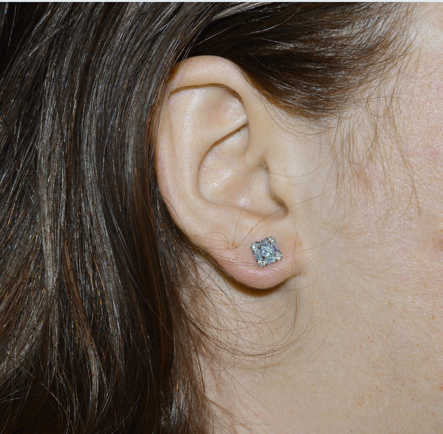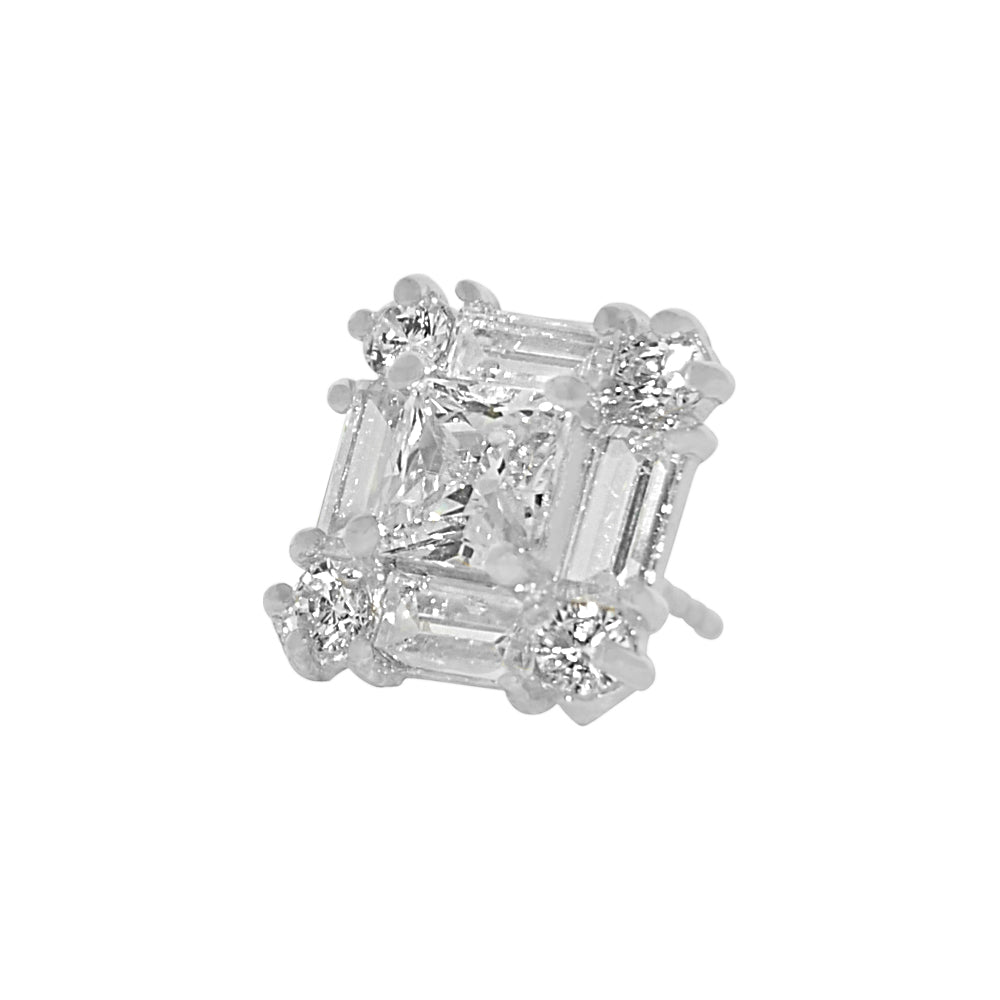 Crafted from 14k white gold, these elegant small square stud earrings feature a stunning combination of baguette, round, and princess-cut cubic zirconia stones. At the center of each earring sits a 3 mm square-cut cubic zirconia, framed by 8 baguette-cut and 8 round-cut stones, creating a captivating and refined sparkle. Measuring approximately 1/4 inch (7 mm) in both length and width, these earrings are a perfect accessory for any occasion. The baguette-cut stones measure 1 mm by 2.6 mm, while the round-cut stones are 2 mm in size. These earrings secure comfortably with butterfly friction closures, offering both style and comfort.