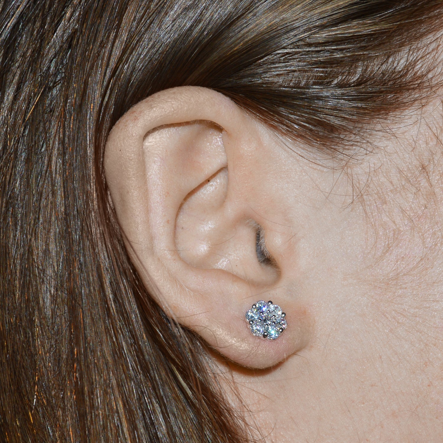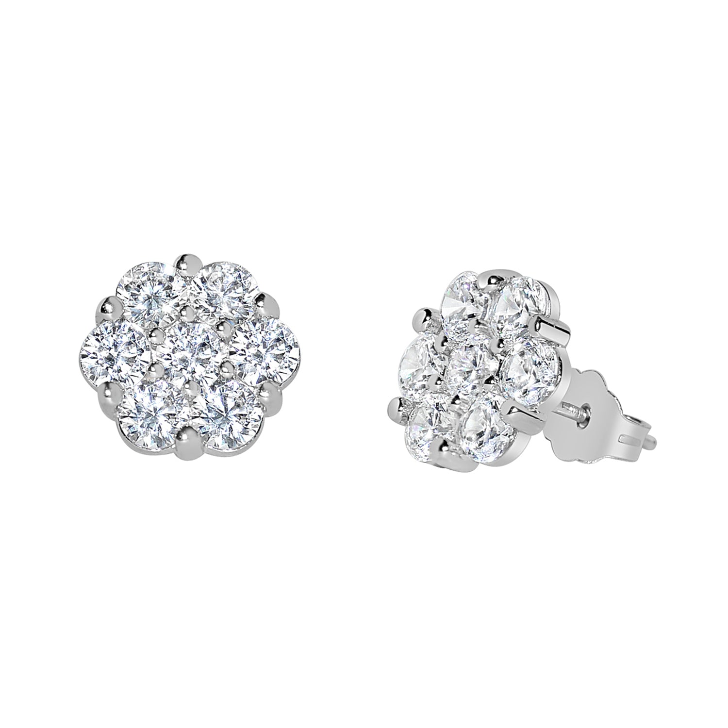 These dazzling floral stud earrings, crafted from 14k white gold, feature 14 round-cut cubic zirconia in a shared prong setting, forming beautiful, sparkling flowers. Measuring approximately 3/8 inch (9.5 mm) in both length and width, these earrings offer a radiant look that is perfect for special occasions or everyday elegance. The prong-set stones enhance the brilliance of each cubic zirconia, making these studs a chic and versatile accessory. Each cubic zirconia measures 3 mm and offer a glittery appearance. These earrings are secured with butterfly friction closures, offering a secure and comfortable fit for long-lasting wear.