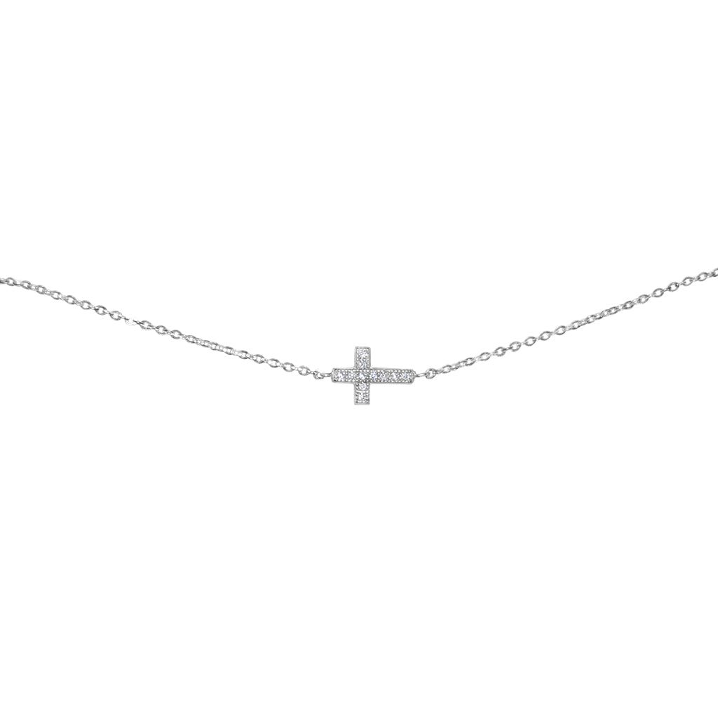 Discover the elegance of our dainty sideways cross bracelet, expertly crafted from 14-karat white gold. This exquisite piece features a delicate cross enhanced with pave-set cubic zirconia, each round-cut gem contributing brilliant sparkle that reflects light beautifully. The bracelet is suspended on a finely woven cable chain measuring 7 inches in length, featuring a 1-inch extension for a customizable fit. Its design makes it suitable for wearing alone or layering with other favorites. Key details include a charm that measures 6.37 mm wide, 12 mm long, and 1.38 mm high, perfectly balancing understated charm with elegance. The chain has a width of 0.57 mm, allowing it to curl and drape gracefully on the wrist. With 11 expertly pave-set cubic zirconia stones, this bracelet serves as a radiant symbol of faith and style. Finished with a high-polish sheen, it reflects personal beliefs and fashion sensibilities. This bracelet is intended for individuals aged 14 and above, making it a meaningful addition to any jewelry collection.