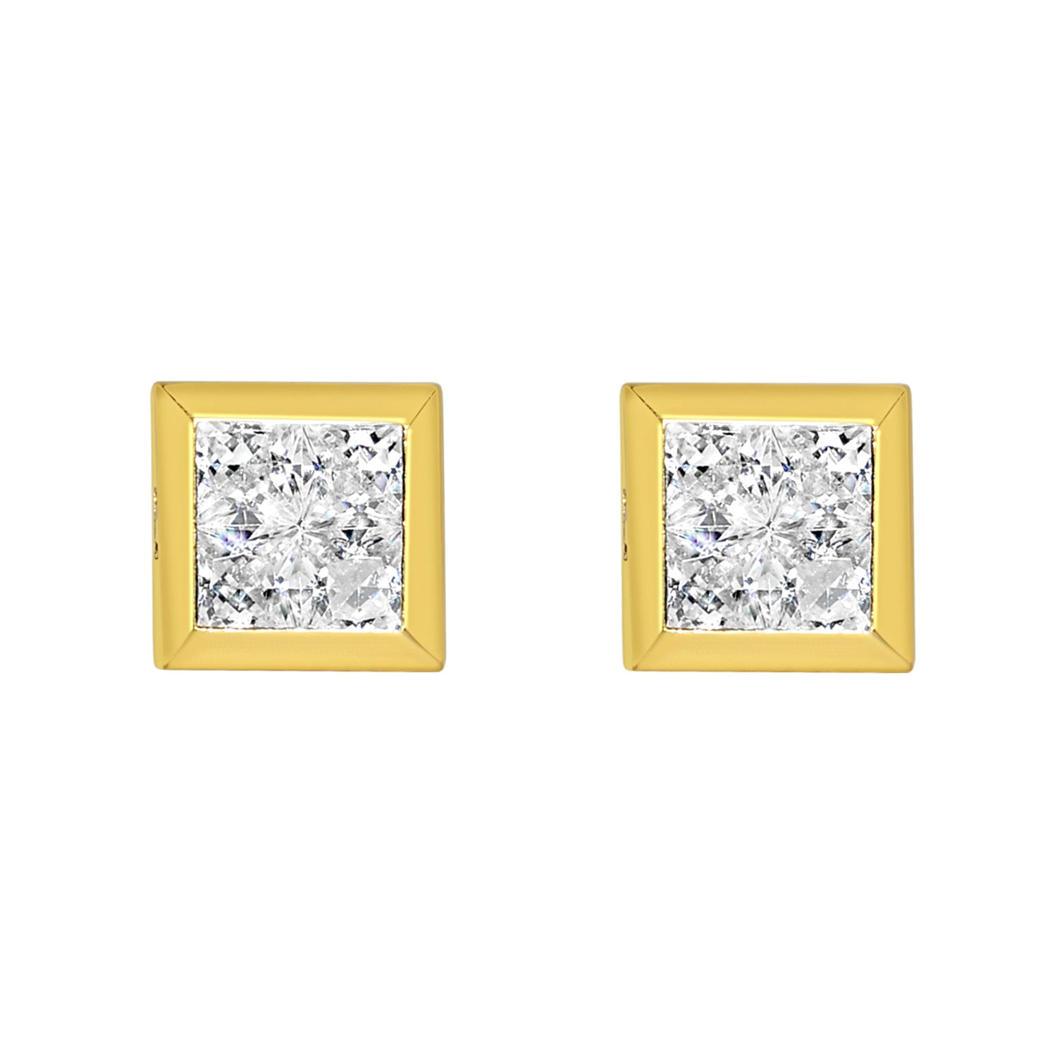 These 14k yellow gold stud earrings showcase a stunning composite of princess-cut cubic zirconia, arranged in a seamless square setting. The invisible setting allows the 8 square-cut stones, each measuring 3 mm, to create the illusion of a single, larger gemstone for a truly brilliant effect. Measuring just under 5/16 inches (7.25 mm) in both length and width, these earrings offer a polished, sleek look perfect for any occasion. The earrings secure comfortably with butterfly friction closures.