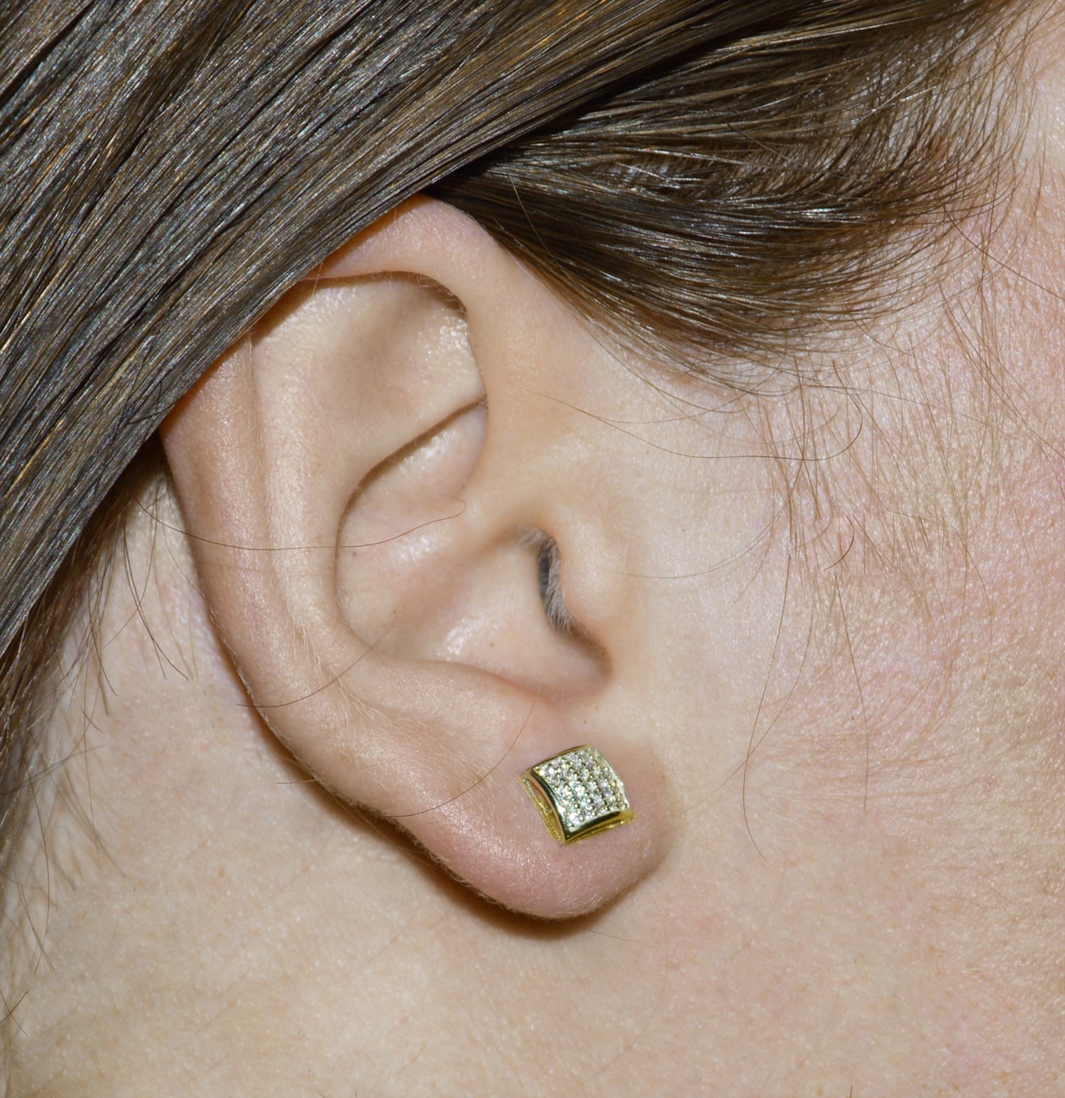 These elegant 14k yellow gold square-shaped stud earrings feature glittering rows of round-cut cubic zirconia in a micropave setting, designed to dazzle with brilliance. The slightly curved design enhances the sparkle of the stones, making these studs a standout accessory. Perfect for both men and women, these versatile earrings add a touch of sophistication to any look. With 50 round-cut cubic zirconia, each measuring 1.25 mm, the earrings measure 7 mm in both width and length (approximately 1/4 inch). They secure comfortably with butterfly closures. These beautifully crafted studs are an understated yet eye-catching addition to any jewelry collection.