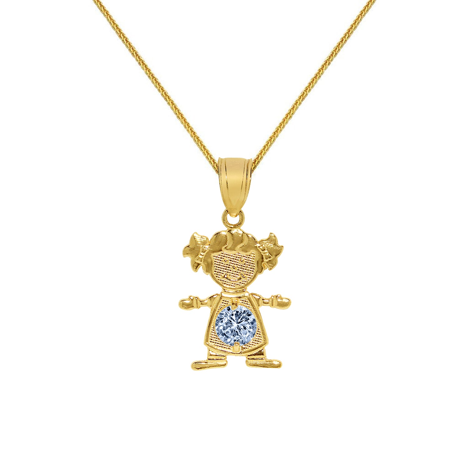This 14-karat yellow gold pendant features an adorable smiling little girl with pigtails and a prong-set, round-cut March birthstone cubic zirconia. This pendant is a perfect gift for a new mother! You can also surpise your own mother on Mother's Day with this cute little charm with your birthstone color!The pendant is completed with a matching 14k yellow gold 0.8-mm square wheat chain with a diamond-cut design in your choice of 16 inches to 22 inches long.