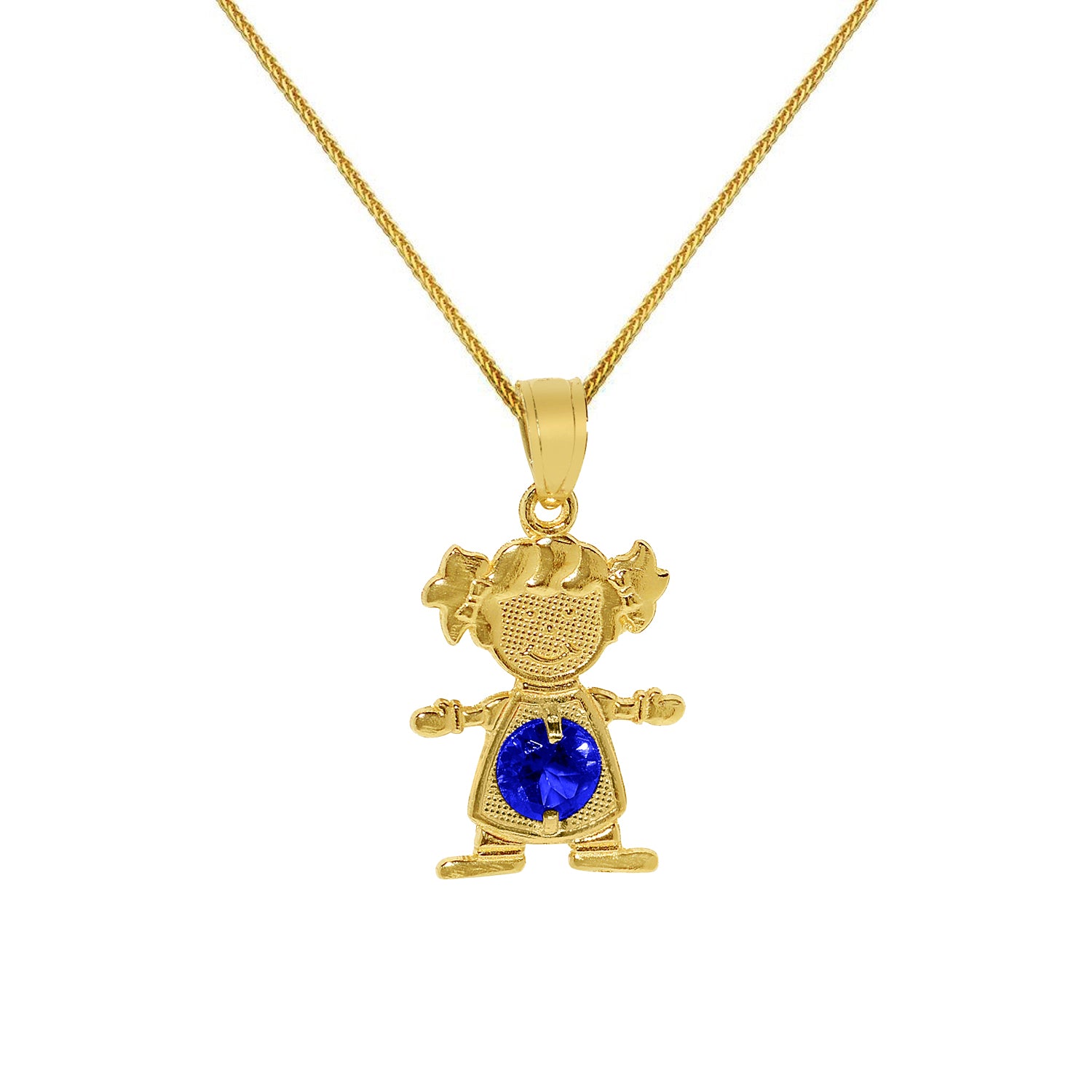 This 14-karat yellow gold pendant features an adorable smiling little girl with pigtails and a prong-set, round-cut September birthstone cubic zirconia. This pendant is a perfect gift for a new mother! You can also surpise your own mother on Mother's Day with this cute little charm with your birthstone color!The pendant is completed with a matching 14k yellow gold 0.8-mm square wheat chain with a diamond-cut design in your choice of 16 inches to 22 inches long.