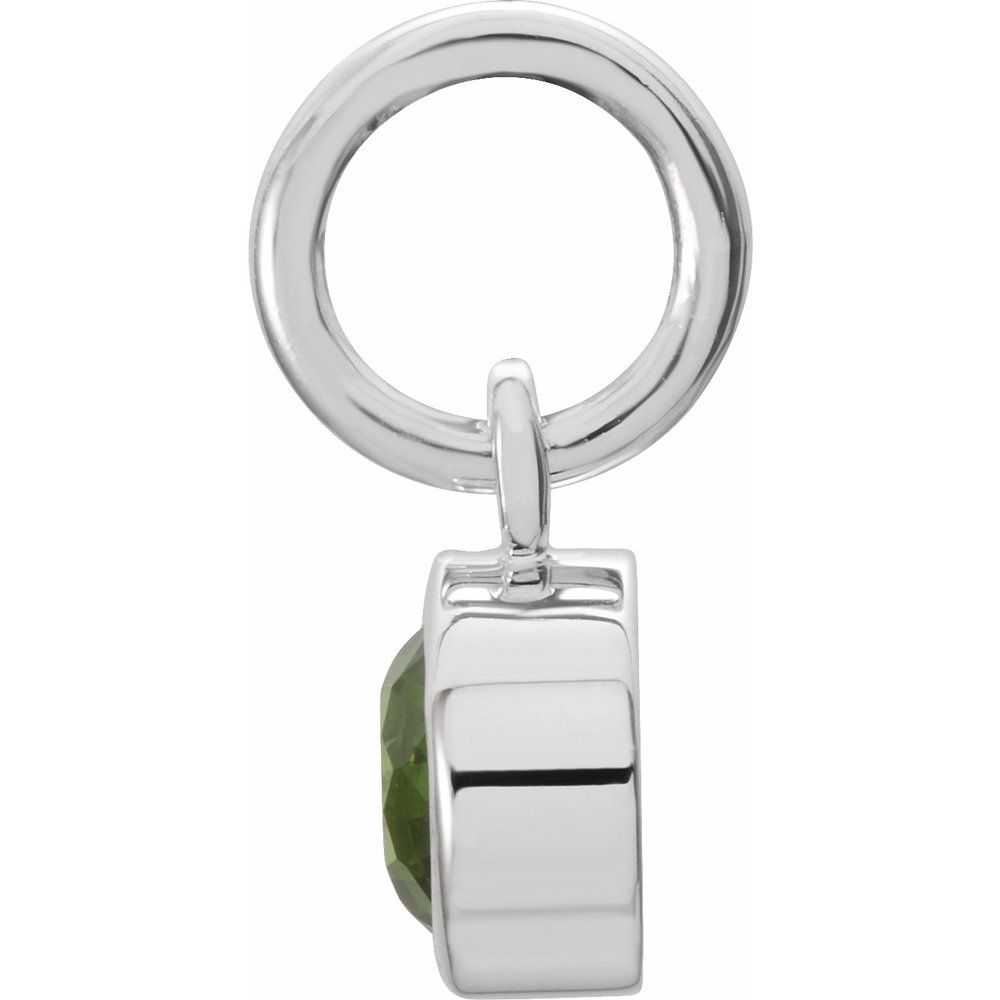Crafted of polished sterling silver this beautiful imitation peridot charm adds a vibrant pop of color to any charm bracelet or necklace. Peridot is August's birthstone and features a spring gold-green color. The stone on this charm measures 4mm round and brings a bold, classic look. This versatile piece can be worn on a necklace or bracelet, and its compatibility with most US and European charm bracelets makes it easy to incorporate into your existing jewelry collection. Weighing approximately 0.26 grams grams with a polished finish, it is an ideal addition to a birthday or Mother's Day gift. Imitation gemstones are man-made crystals that simulate the appearance, but not the properties, of natural gemstones, offering the look without the price tag. **JEWELRY is NOT INTENDED for CHILDREN UNDER 14.** All weights and measurements are approximate and may vary per item.