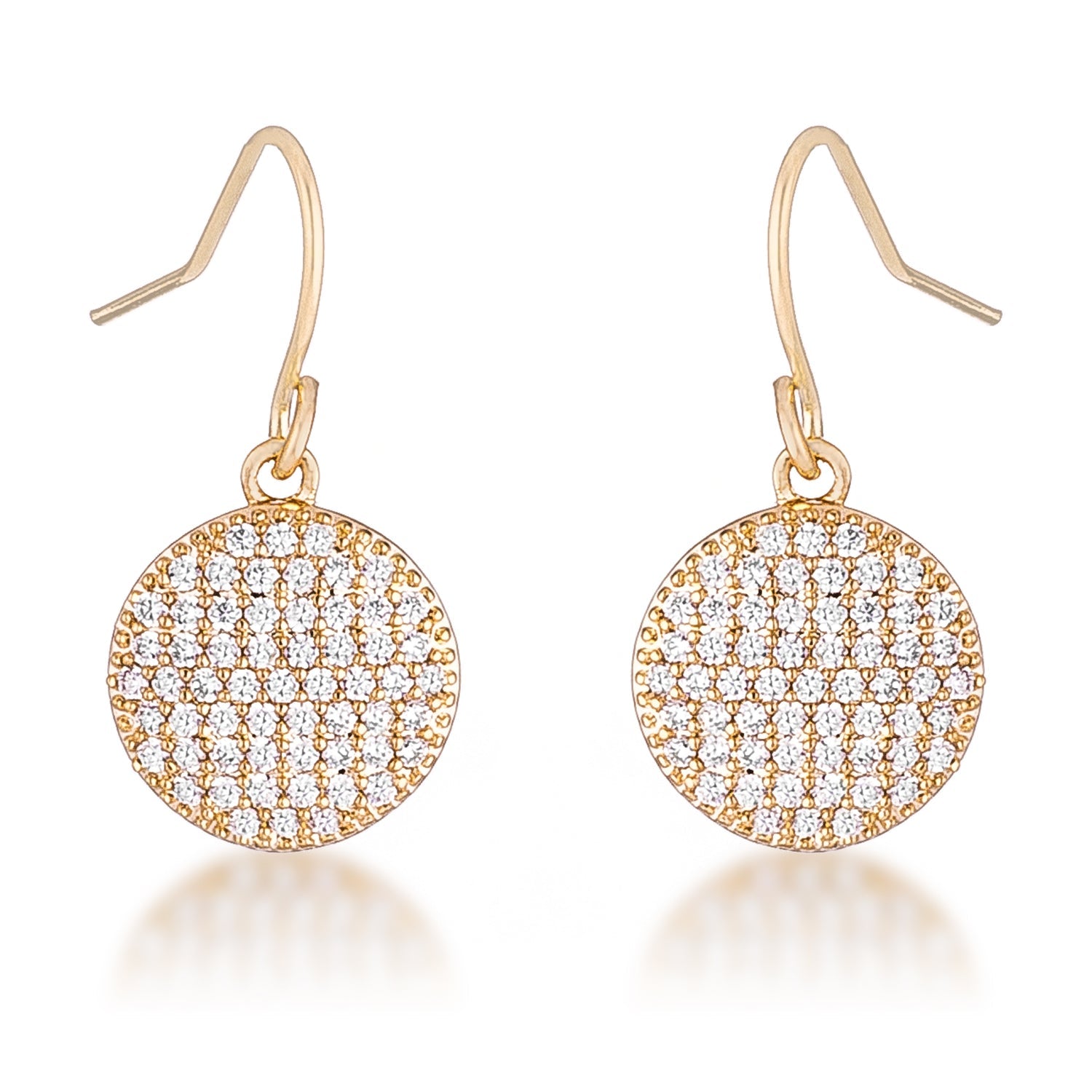 These stunning earrings feature a dangling pave disc that is beautifully set with sparkling clear cubic zirconia. These dainty fashionable earrings come in a brilliant gold tone finish.
