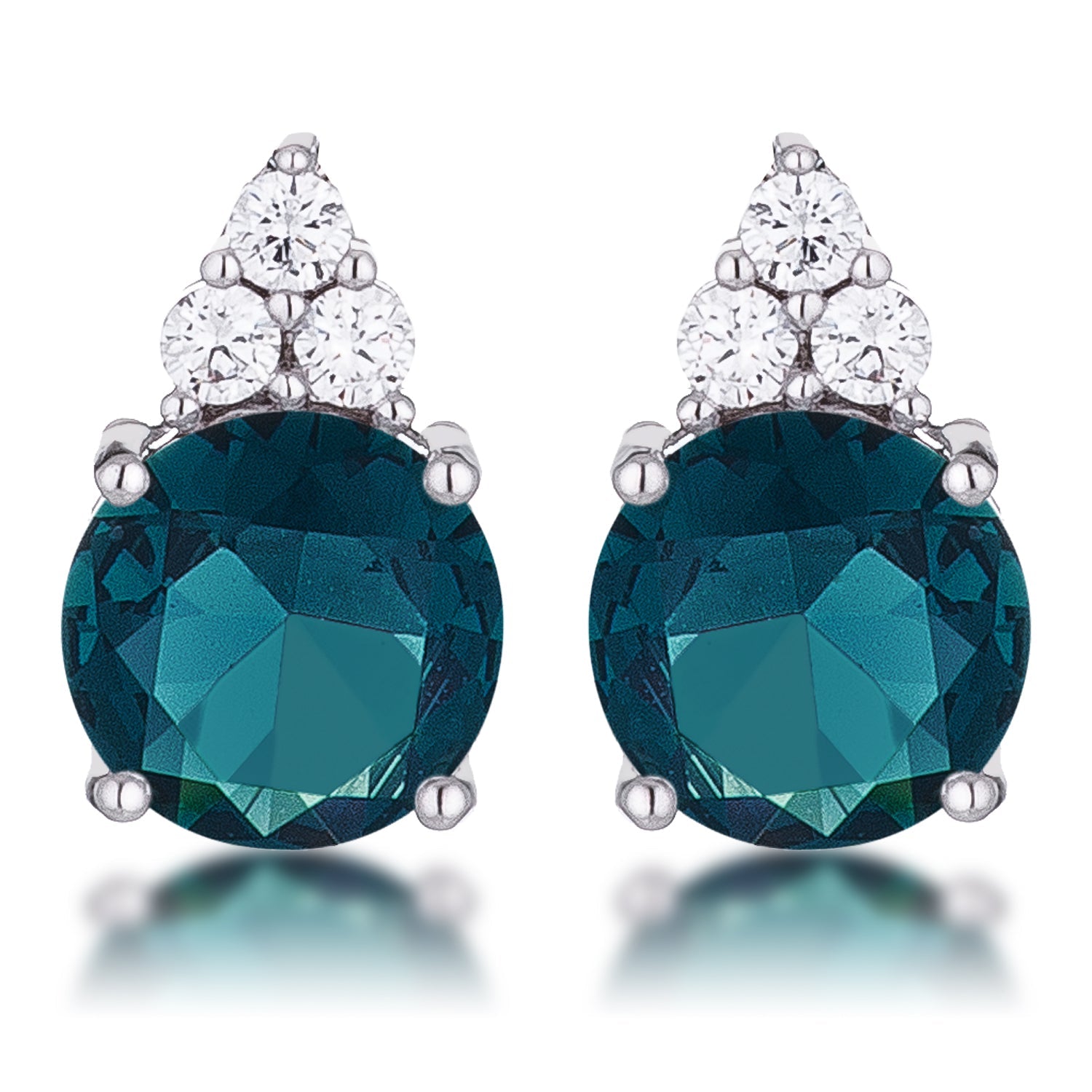 These simple yet elegant earrings feature a mesmerizing blue green stone. A trio of glistening white cubic zirconia rests atop the eye catching round peacock green sparkler. These earrings are bathed in a beautiful rhodium finish for a brilliant shine and is a classic piece you will treasure for a long time.