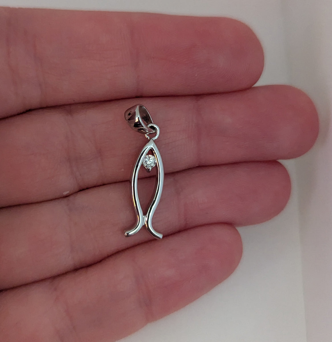This charming sterling silver highly polished Ichthys Jesus fish pendant features a sparkling round-cut cubic zirconia at its center. Crafted from polished .925 sterling silver, the pendant measures 6.38 mm in width and 26.81 mm in length, with a total metal weight of 1.88 grams. This pendant is a wonderful gift for special occasions such as Easter, Baptism, Communion, or Confirmation, and serves as a heartfelt present for someone you love. Please note that this pendant is sold without a chain; however, a chain can be purchased separately and will fit any bail up to 2.5 mm wide.