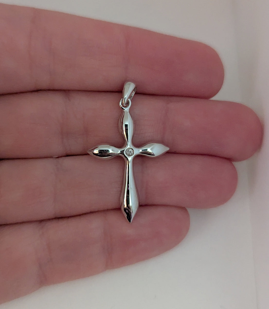 Add a meaningful touch of elegance to your jewelry collection with this stunning sterling silver cross pendant. Expertly crafted from polished .925 sterling silver, this timeless design features a brilliant round-cut cubic zirconia bezel set at the center, offering a radiant focal point that captures the light beautifully. The cross is thoughtfully designed with tapered edges for a sleek, refined silhouette that enhances its luxurious appeal. Measuring 20.52 mm in width and 37.4 mm in length, and weighing 2.43 grams, this piece is the perfect blend of grace and durability. Whether you're shopping for a meaningful Easter gift, celebrating a Baptism, First Communion, or Confirmation, or simply looking for a heartfelt present for someone special, this cross pendant delivers both spiritual significance and sophisticated style. Please note that this pendant is sold without a chain; however, it accommodates chains up to 2.5 mm wide, allowing you to personalize the look with your choice of necklace. All measurements and weights are approximate and may vary slightly, ensuring each piece is as unique as the person who wears it.